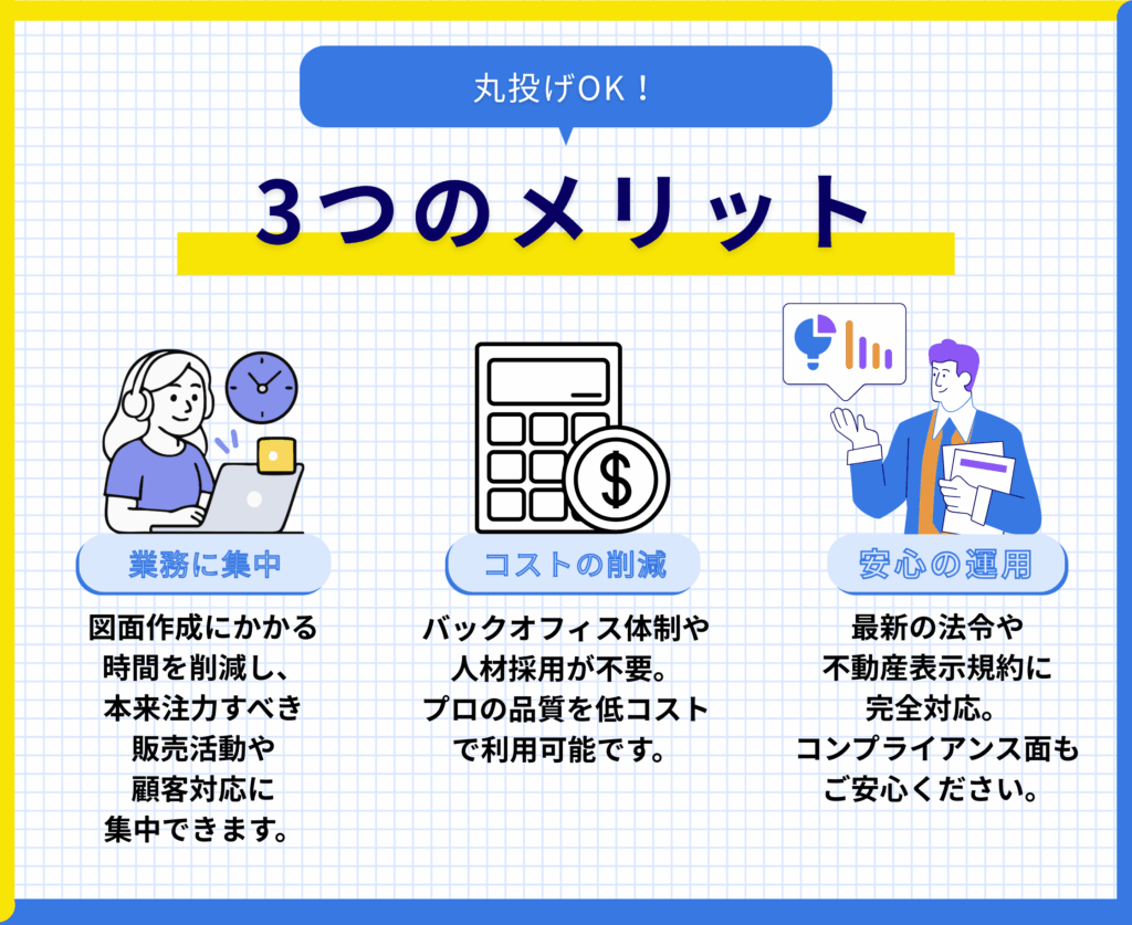 実際ご依頼頂いている方から制作コストは発生する反面、本来の販売業務に集中でき、販促としての機能を持てる図面が手に入り「相乗効果は高い」とのお声も戴けております。